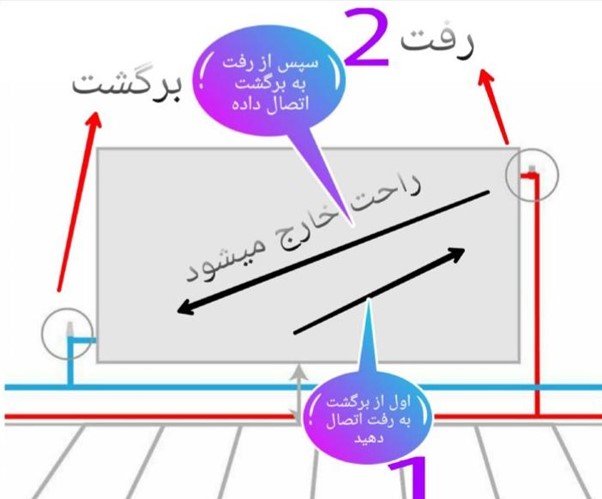 - چهار عدد شلنگ در قسمت پایین رادیاتور مشاهده می شود. شما باید شلنگ آب سرد را به شیر رفت و شلنگ آب گرم را به شیر برگشت وصل کنید. در این لحظه شما ساختار رادیاتور را به هم ریخته اید آن را کاملا معکوس نموه اید.